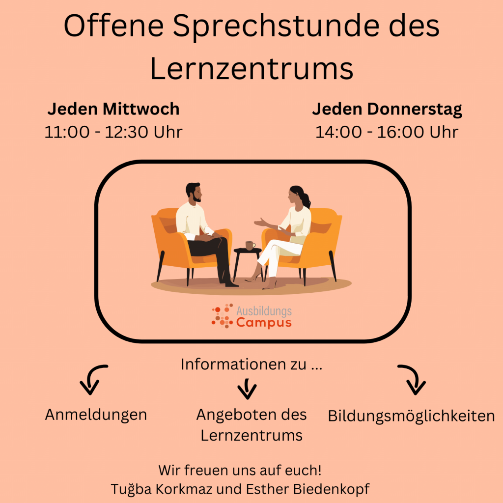 Zweimal die Woche bieten die Koordinatorinnen des Lernzentrums eine offene Sprechstunde an. Hier bietet sich die Möglichkeit Informationen zu Anmeldungen für Kurse, den Angeboten des Lernzentrums sowie wie Bildungsmöglichkeiten im Allgemeinen zu erhalten.