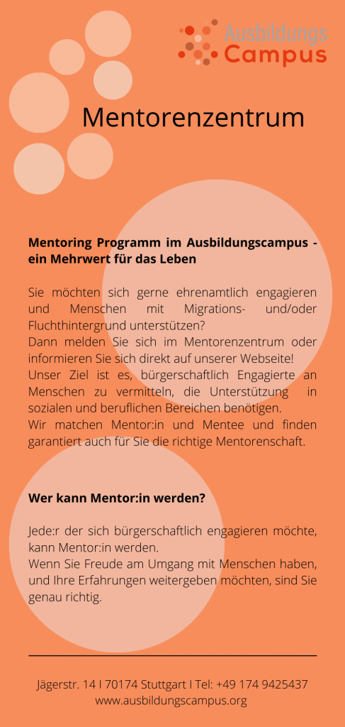 Zur beruflichen und persönlichen Weiterentwicklung von jungen Menschen mit Flucht- und/oder Migrationsbiografie ist deren Begleitung durch Mentor:innen ein wesentlicher Schritt zur erfolgreichen Integration. Ob berufliche Orientierung, Vorbereitung auf wichtige Termine oder Lernunterstützung – die Bedarfe unserer neuen Mitbürger:innen sind vielfältig und sehr individuell.