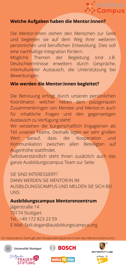 Wenn Sie Freude am Umgang mit Menschen haben, offen und kommunikationsfähig sind und Ihre Erfahrungen rund um die berufliche Entwicklung an junge Menschen weitergeben möchten, freuen wir uns auf Ihre Kontaktaufnahme. Begleitet werden Sie durch persönliche Koordinator:innen im Ausbildungscampus, die neben dem Zusammenbringen von Mentee und Mentor:in auch für inhaltliche Fragen, Netzwerk und Austausch bereit stehen.