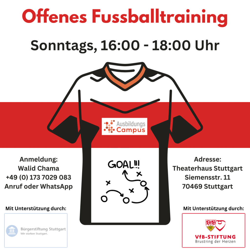 Für alle die gerne Fussball spielen bieten wir mit Unterstützung der VfB-Stiftung Brustring der Herzen und der Bürgerstiftung Stuttgart ein wöchentliches Fussballtraining an. Jede/Jeder ist hier herzlich willkommen. Unter Anleitung eines Trainers wird hier jeden Sonntag zwei Stunden lang Fussball gespielt und Spaß gehabt. Aktuell findet das Training in der Halle des Theaterhauses Stuttgart statt.