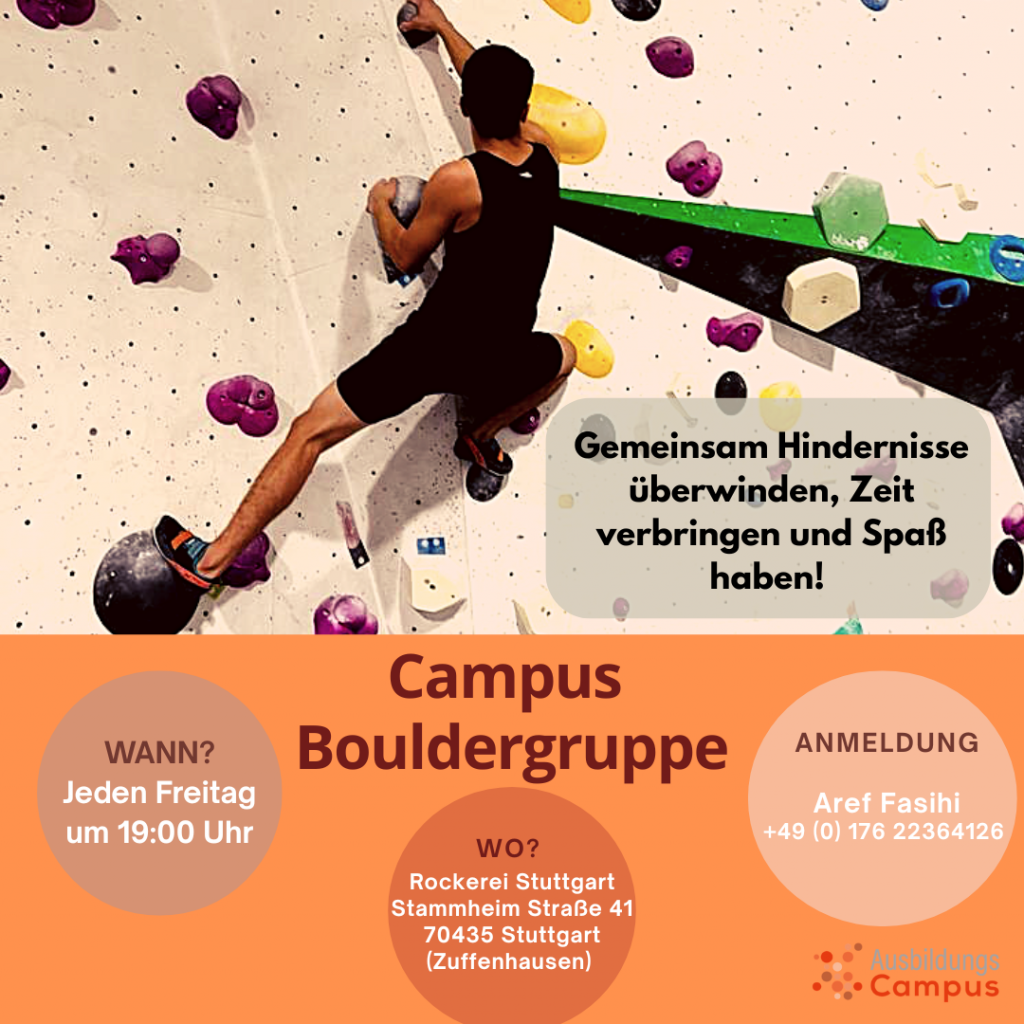 Jeden Freitag gibt es für jede/n die Möglichkeit in der Rockerei in Zuffenhausen bouldern zu gehen. Die Anmeldung erfolgt bei Aref Fasihi.