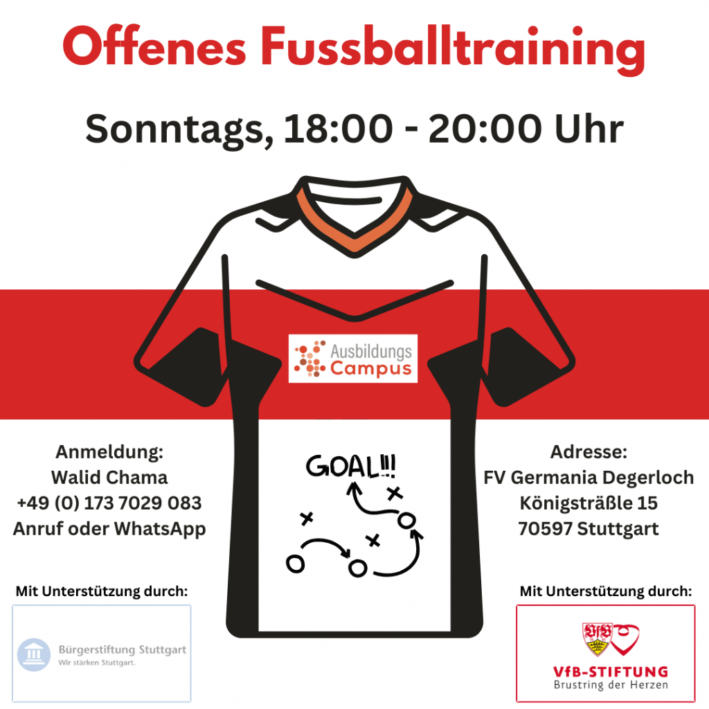 Für alle die gerne Fussball spielen bieten wir mit Unterstützung der VfB-Stiftung Brustring der Herzen und der Bürgerstiftung Stuttgart ein wöchentliches Fussballtraining an. Jede/Jeder ist hier herzlich willkommen. Unter Anleitung eines Trainers wird hier jeden Sonntag zwei Stunden lang Fussball gespielt und Spaß gehabt. Aktuell findet das Training beim FV Germania Degerloch statt.
