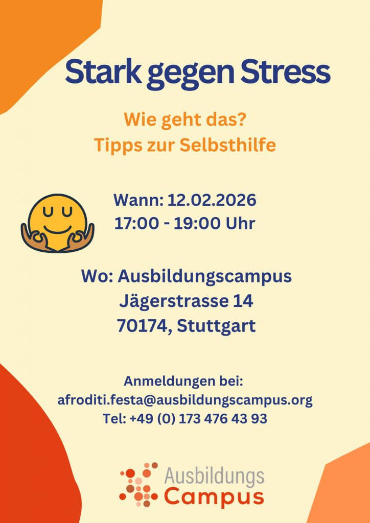 Am 12. Februar findet im Ausbildungscampus ein Workshop zum Thema „Stark gegen Stress“ statt. Hier bekommt ihr Tipps, wie ihr mit Stress am besten umgehen könnt. Die Anmeldung erfolgt bei Afroditi Festa.